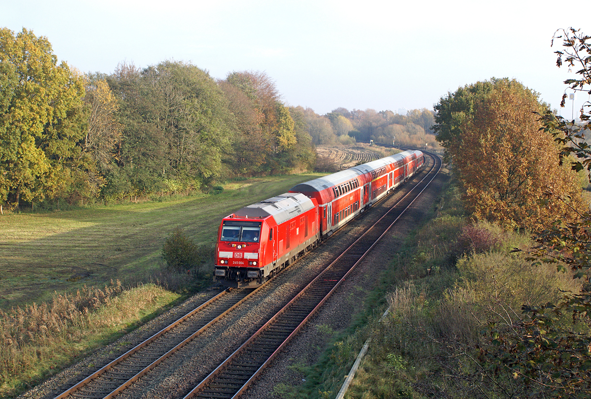 245 004 zieht am 09.11.2019 bei Heilgenstedten-Julianka eeinen RE nach Westerland.