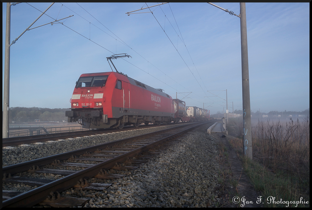 Am frühen Morgen des 1.05.2013 um 6:40:50 passierte mich an meiner Fotostelle in Dänischburg,Alt Lübeck die 152 101-2 der DB Schenker Rail Deutschland AG mit einem Gemischten Güterzug,der grade die Schwartau überquert.Der Zug kommt aus Lübeck,und ist in Richtung Travemünde Skandinavienkai unterwegs.Es zog sich noch ein leichter Nebel über das Land. Jan Fuhlbrügge