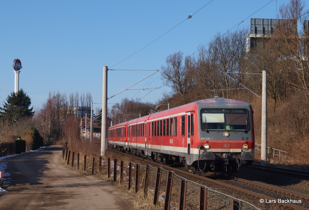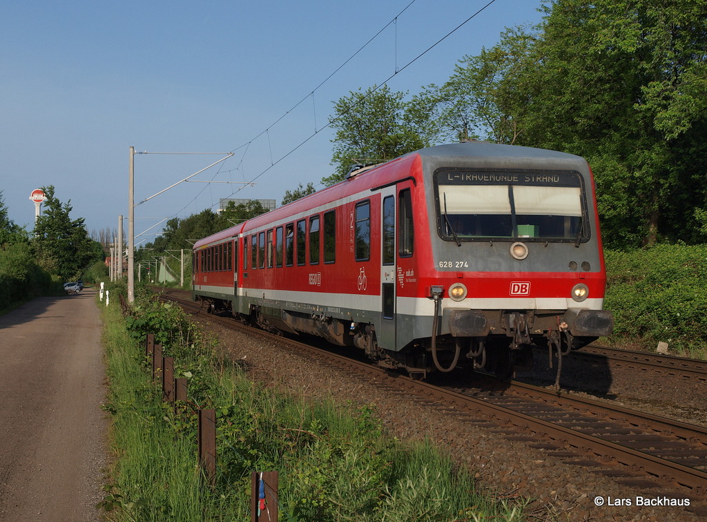 928 238 und 628 281 sind am 3.04.13 im RB-Pendel zwischen Lübeck Hbf und Lübeck-Travemünde Strand eingeteilt und passieren hier den ehm. Haltepunkt Bad Schwartau-Waldhalle. Lars Backhaus