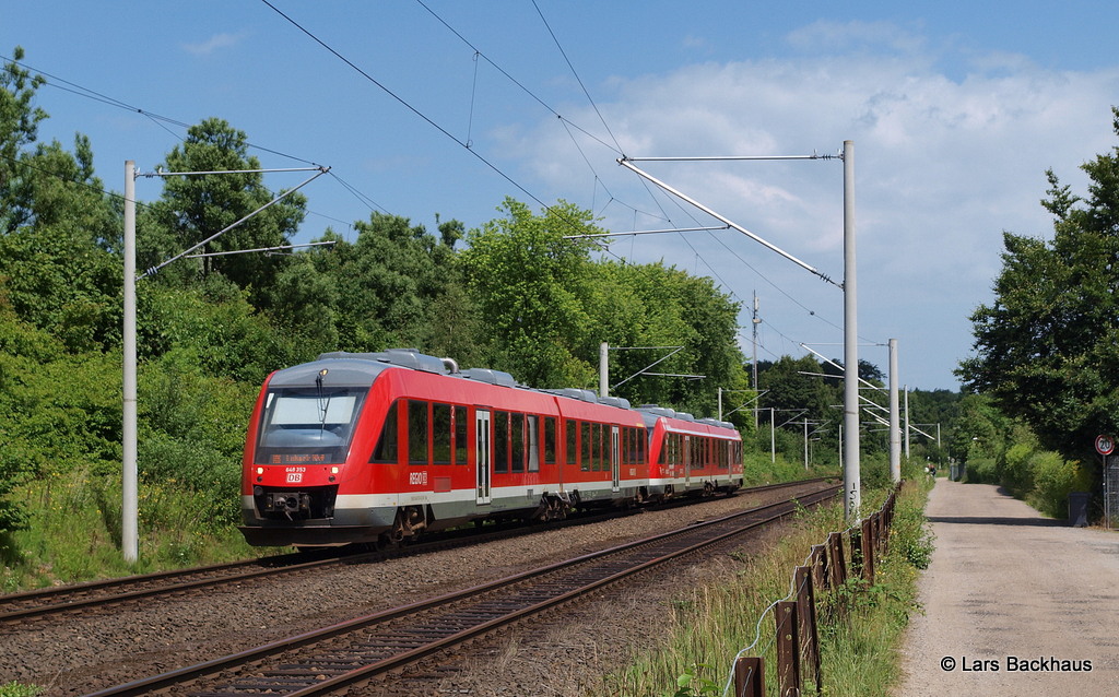 648 353 und 648 958 sind am 02.07.13 als RB von Lübeck Travemünde-Strand nach Lübeck Hbf unterwegs. Aufgenommen bei Bad Schwartau-Waldhalle. Lars Backhaus