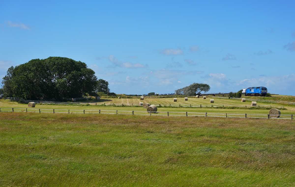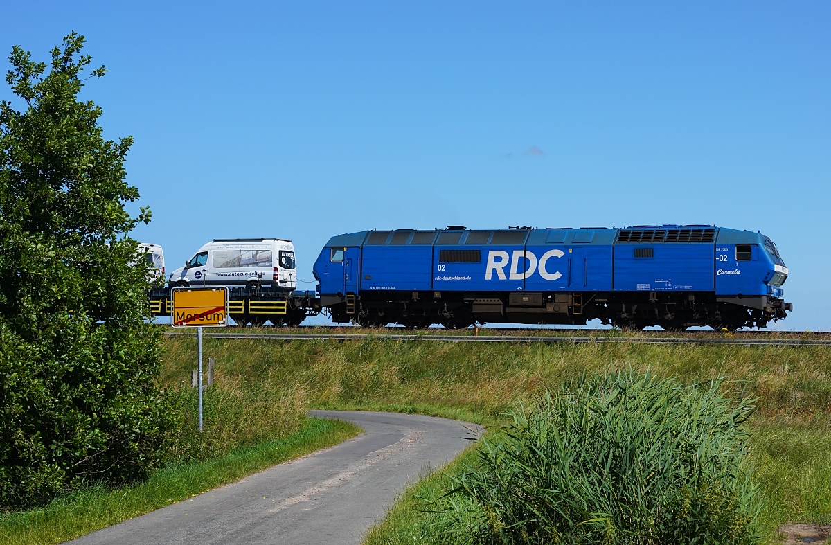 Die sechsachsige RDC-251 002-2, die am 28.06.2024 mit einem Autozug bei Morsum in Richtung Westerland fährt, gehört zu einer Serie von 12 Lokomotiven, die Siemens 1997 an die Norwegische Staatsbahn lieferte, die sie zwischen Trondheim und Bodø einsetzte. Allerdings bewährten sie sich dort wegen der strengen klimatischen Bedingungen nicht und wurden 1999 an den Hersteller zurückgegeben. Neben der 251 002-2 setzt RDC auch die 251 003-0 ein. Horst Lüdicke
