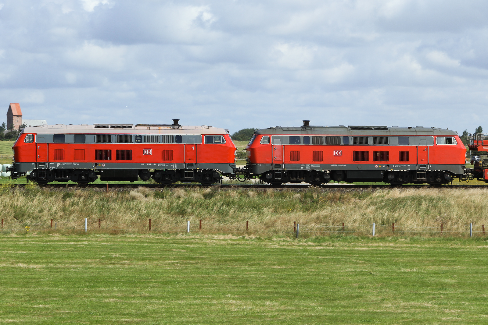 Am 22.04.2025 schiebt die 218 470-6 einen RE 6 von Westerland nach Hamburg-Altona über den Hindenburgdamm. Der Einsatz der Baureihe 218 zusammen mit NAH.SH-Garnituren ist eher ungewöhnlich (Bildausschnitt). Horst Lüdicke