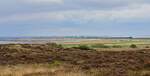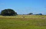 Vom Wanderweg zwischen Munkmarsch und Keitum auf Sylt geht der Blick über das Wattenmeer bis zum Hindenburgdamm. Am 26.04.2025 begegnen sich dort zwei von der Baureihe 245 gezogene Züge, links vor einem aus Niebüll kommenden Autozug, rechts mit einem RE 6 von Westerland ach Hamburg-Altona (Bildausschnitt, ungefähre Positionsangabe). Horst Lüdicke