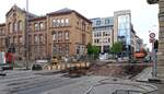 Im Normalfall sind hier an dieser neuralgischen Kreuzung pro Tag fast 30.000 Fahrzeuge unterwegs. Gebaut wurde im 3-Schicht-System, auch um die Unterbrechung im Stadtbahnverkehr so gering wie möglich zu halten. Die Augustusbrücke überspannte früher den Fluß Gera, bevor dieser in sein heutiges Flußbett umgeleitet wurde; 02.08.2020 Frank Thomas