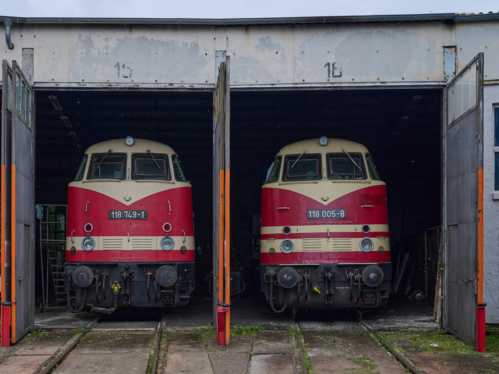 120 274 wartet im strömendem Regen vor dem Arnstädter Lokschuppen auf neue Einsätze. (Fotoveranstaltung 27.07.2024). Neben ihr warten im Schuppen 102 965 und 118 749. Michael Brunsch