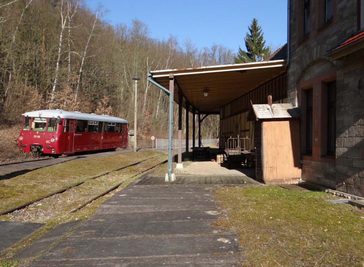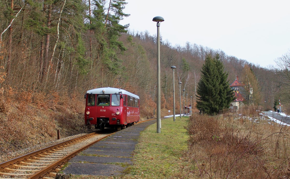 Da sich der 641 020 bei der HU befindet, fährt 772 140 zur Zeit zwischen Rottenbach und Katzhütte im Planverkehr. Hier zu sehen am 19.02.18 in Schwarzburg. Alexander Hertel