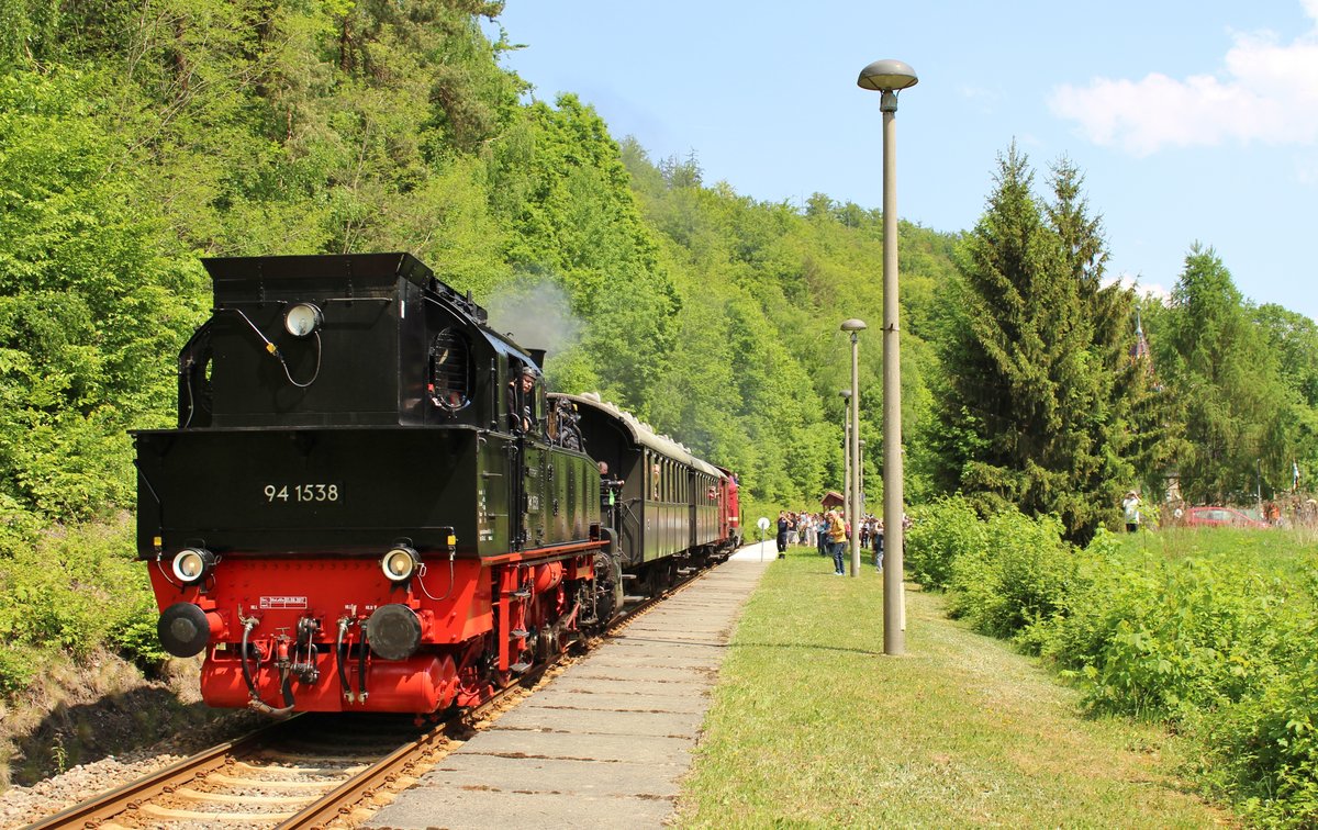 94 1538 fuhr am 12.05.18 " Die letzte Waffe" von Rudolstadt nach Schwarzburg zur Eröffnung des Zeughauses auf Schloss Schwarzburg. Hier ist der Zug in Schwarzburg bei der Ausfahrt nach Katzhütte zu sehen. Alexander Hertel