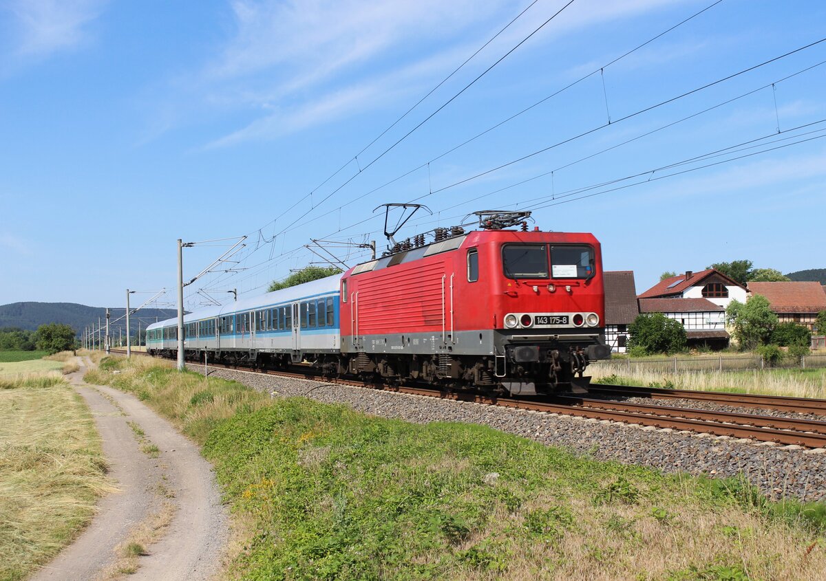 Ab 01.06.22 gab es den RB 25 Ersatzverkehr zwischen Halle-Saalfeld und zurück. 143 175-8 als RB 31397 war am 22.06.22 in Etzelbach zu sehen. Alexander Hertel