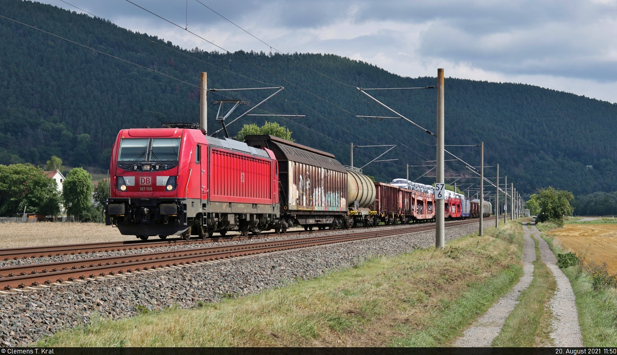 Spot an für 187 158-1 mit Gemischtwarenladen, der bei Etzelbach (Uhlstädt-Kirchhasel) Richtung Saalfeld(Saale) fährt.
