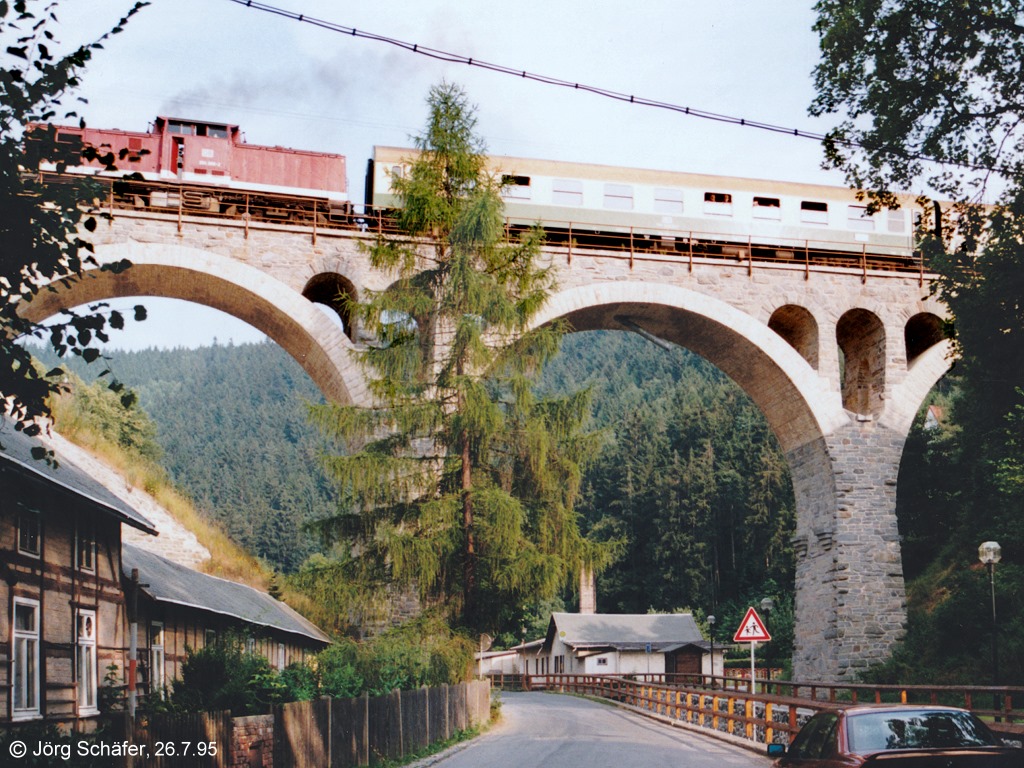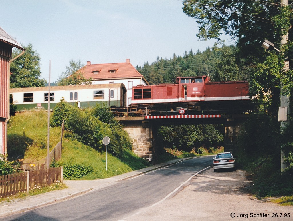 Die „Oberlandbahn“ führt von Norden her am Waldhang entlang ins Tal nach Ziegenrück hinab. Kurz vor dem Bahnhof überquert sie noch diese Brücke. (204 869 am 26.7.95)