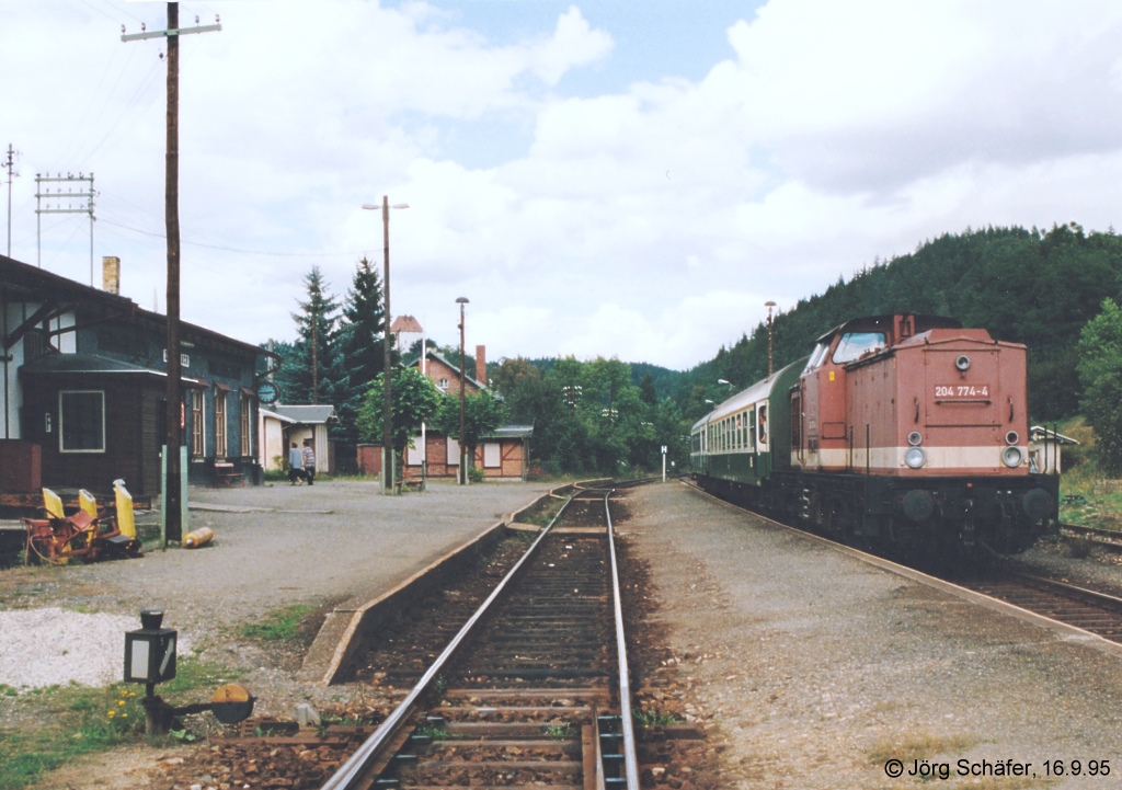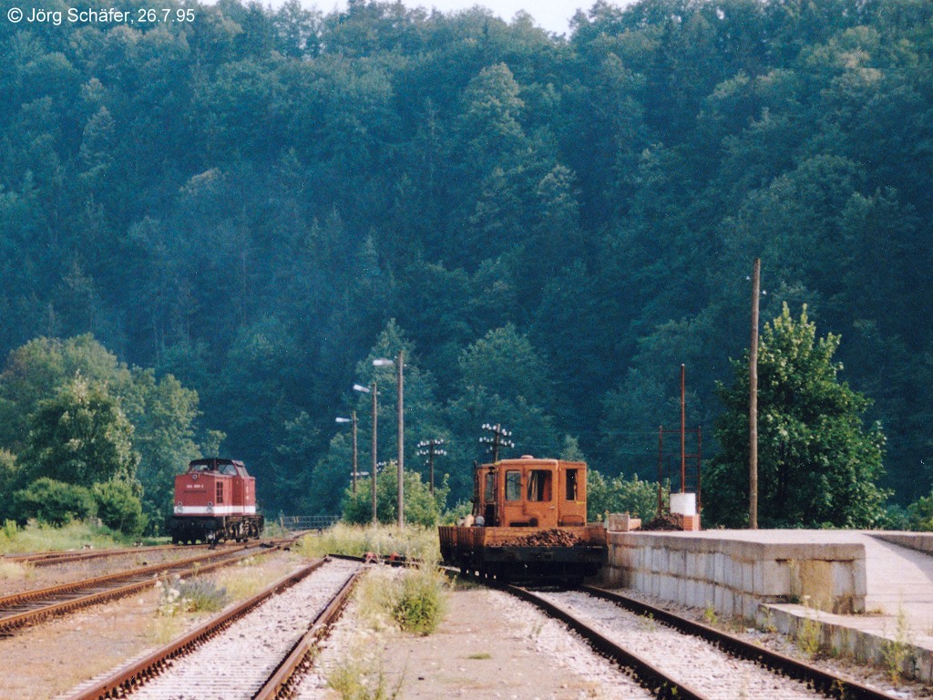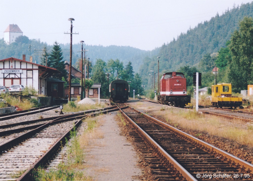 Das Bild von der umsetzenden 204 869 zeigt, wie weit man in Ziegenrück Richtung Lobenstein hinaus fahren musste, um die Einfahrweiche zu erreichen.