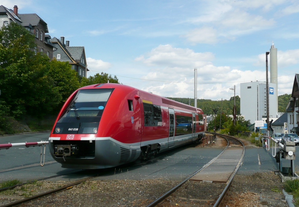 Bullenkraft wird auf der Strecke Saalfeld - Hockeroda - Wurzbach - Unterlemnitz - Lobenstein - Blankenstein gefordert. Die Streckenführung mit ihren engen Kurven, den Steigungen und der Spitzkehre in Wurzbach hat den Charakter einer Gebirgsbahn. Die Schranken schlossen sich in Blankenstein, zuerst passierte V 60 (Ost) Werklok der ZPR den BÜ aber die Schranken blieben geschlossen. VT 009 der Erfurter Bahn stand im Bahnhof, also konnte kein Personenzug mehr kommen. Fast lautlos rollte vorn Gravita 261 014 im Gefälle über den BÜ, hinten im Sandwich 261 019. Die beiden brachten Wagen für die Zellstofffabrik in Blankenstein. Die V 60 wird dann den Zug in zwei Teilen ins Werk bringen. KBS 557 Blankenstein 13.08.2012 Bahnstrecke 6683 Triptis - Unterlemnitz - Lobenstein - Blankenstein -(Marxgrün) Der nördliche Abschnitt ist als Thüringische Oberlandbahn, der Südabschnitt als Fränkische Höllentalbahn bekannt. Strecke 6686 Hockeroda - Wurzbach Strecke 6709 Wurzbach - Unterlemnitz