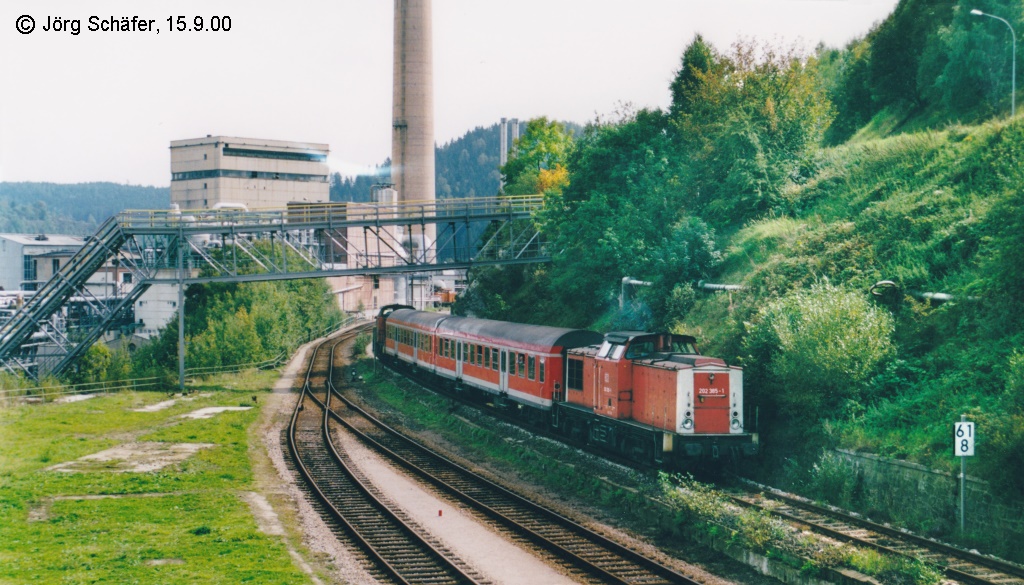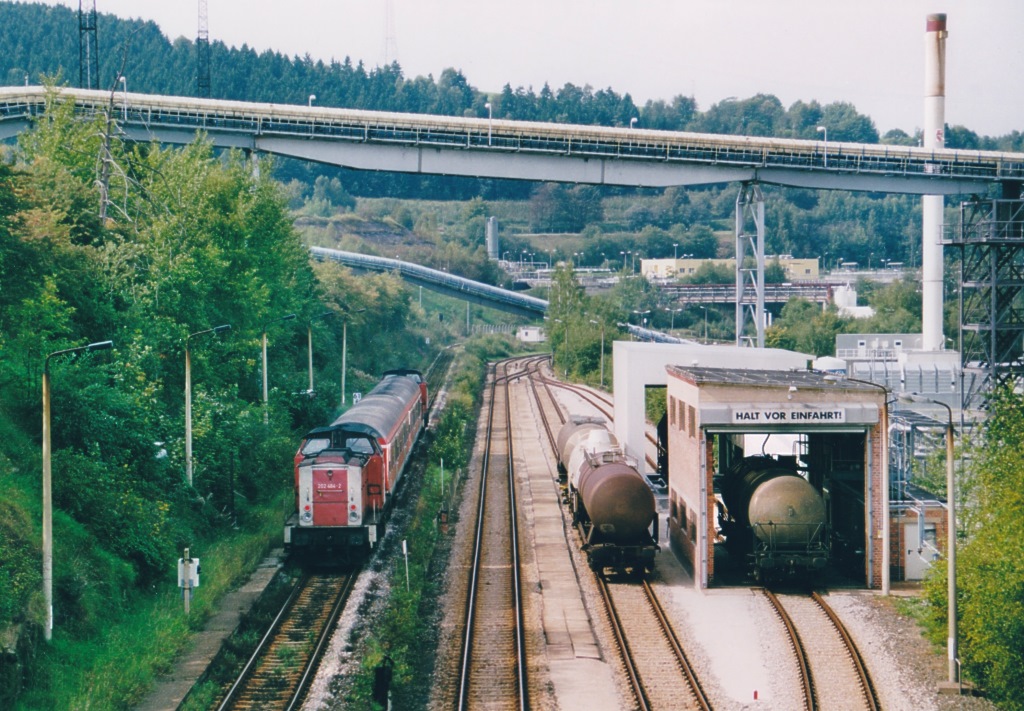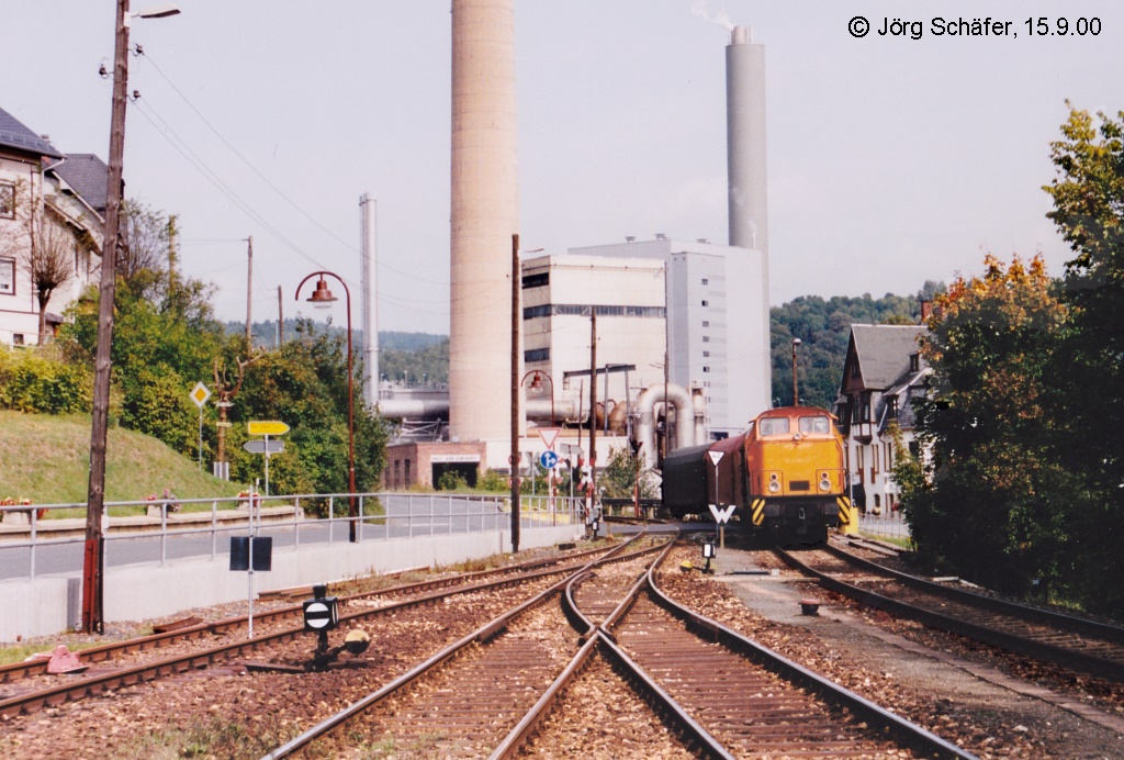 Blick von der Fußgängerbrücke zur Fabrik Rosenthal nach Norden am 15.9.00: Eine  Sandwich-Garnitur  mit zwei Loks der Baureihe 202 aus Saalfeld wird gleich ihre Endstation Blankenstein erreichen. Links unten sieht man einen Bahnsteig, an dem wohl früher unveröffentlichte Personenhalte stattfanden, damit ein Teil der 500 Mitarbeiter direkt im Werksgelände aussteigen konnte.