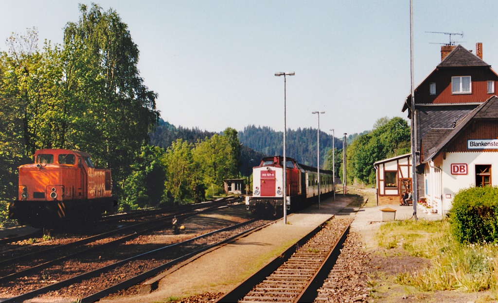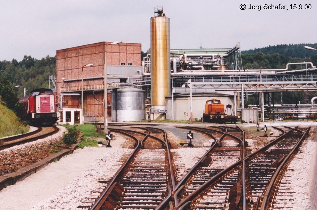 Blick vom Bahnübergang am Blankensteiner Bahnhof nach Norden am 15.9.00: Links schiebt 202 527 ihre Regionalbahn nach Saalfeld, und rechts wartet die Werklok der Zellstoff- und Papierfabrik auf den nächsten Einsatz.