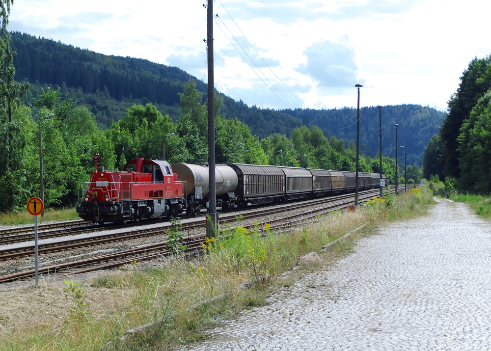Nebenbahn mit umfangreichem Güterverkehr - Nebenbahnen mit Güterverkehr sind in Deutschland selten geworden. Aber im Thüringer Schiefergebirge brummen noch die Güterzüge. Grund dafür ist die Zellstoff- und Papierfabrik in Blankenstein und ZHT in Friesau. Beide Standorte liegen an der Thüringer Oberlandbahn zwischen Triptis und Blankenstein, früher vor der DDR weiter über die fränkische Höllentalbahn nach Marxgrün. Kilometer 0 in Triptis, Blankenstein Km 62,45 und Marxgrün Km 68,76. Zwischen Triptis und Ebersdorf-Friessau (Km 0 - 47,4) ist die Strecke still gelegt aber nicht entwidmet und die Gleise liegen noch. Zwischen Blankenstein und Marxgrün verlief die Grenz zur DDR. Die Strecke wurde still gelegt, die Schienen wurden entfernt. Die Trasse ist aber nicht entwidmet. Anschluß der Bahn an die "weite Welt" besteht über Unterlemnitz und die Sormitztalbahn nach Hockeroda und Saalfeld. Seit Jahrzehnten wird schon im Sandwich gefahren, damit erspart man sich im Kopfbahnhof Wurzbach das Kopfmachen. Durch die großen Höhenunterschiede (fast 400 Meter) und die vielen engen Kurven ist meistens eh eine Doppeltraktion von Nöten. Noch eine Zahl: Fast 78000 Tonnen Zellstoff wurden 2011 mit der Bahn allein nach Bayern befördert. Und das mit einem Umweg von rund 100 Kilometer. Daher wird von Seiten der Firma ZPR Druck ausgeübt den Lückenschluß zwischen Marxgrün und Blankenstein wieder herzustellen. Hinten nach Rechts beginnt das fränkische Höllental. Bahnhof Blankenstein 13.08.2012 Gravita 261 019-4 - Bahnstrecke 6683 Triptis - Marxgrün