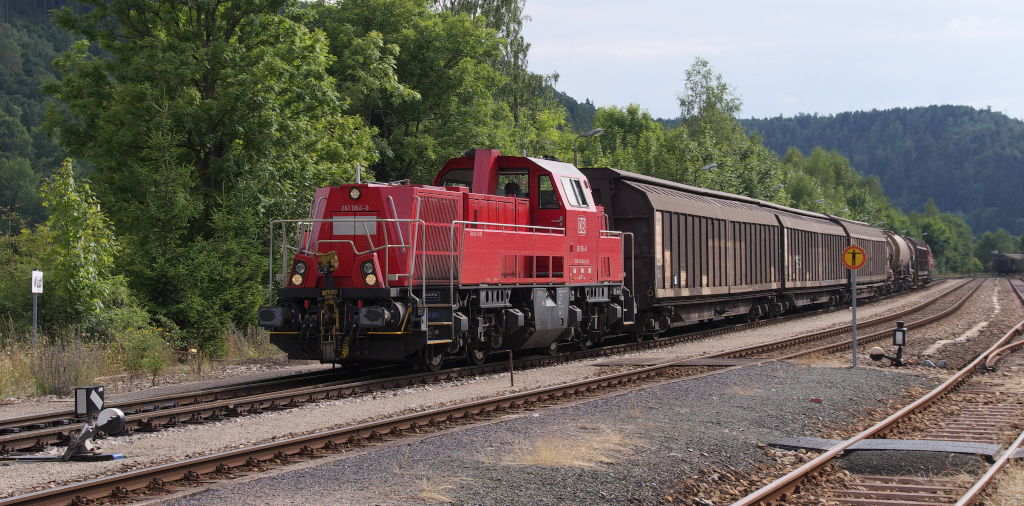 Reger Güterverkehr im Thüringer Schiefergebirge! - Viele Bahnstrecken sind heute Güterverkehr frei! Nicht die Nebenbahn nach Blankenstein und Ebersdorf-Friesau. Die ZPR (Zellstoff- und Papierfabril Rosenthal) in Blankenstein an der Saale und die Firma Klausner Holz in Ebersdorf-Friesau sorgen für einen erheblichen Güterverkehr. Es verkehren Stammholzzüge, sowie Hackschnitzelzüge und auch Kesselwagen mit Laugen und Chemikalien werden befördert. Außerdem werden Papierrollen und Papiererzeugnisse abgefahren. Die Versorgung geht vom Bahnknoten Saalfeld aus. In Bad Lobenstein kreuzen die Züge und die Züge nach Ebersdorf-Friesau ändern dort die Fahrtrichtung. Befahren werden die Bahnstrecken 6683 Triptis - (Ebersdorf-Friesau) - Unterlemnitz - Lobenstein - Blankenstein - (Marxgrün) und die Strecke 6686 Hockeroda - Unterlemnitz, natürlich benutzen die Züge aus und nach Saalfeld auch noch Strecke 6383 Leipzig - Gera - Saalfeld - Probstzella. Voith Gravita 261 064 und als Schiebelok 261 089 bringen einen relativ kurzen Zug mit Papierprodukten und leeren Kesselwagen nach Saalfeld. Im Sandwich wird auch bei leichteren Zügen gefahren, um sich im Spitzkehren - Bahnhof Wurzbach das Kopfmachen zu ersparen. 20.08.2013