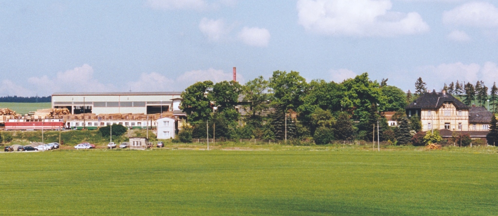 Blick von der Staatsstraße nach Westen auf eine Regionalbahn, die im Bahnhof Ebersdorf-Friesau hält. (18.5.98)