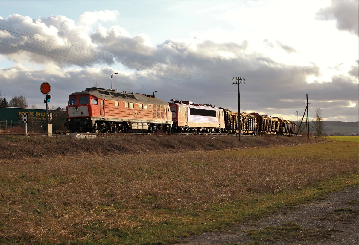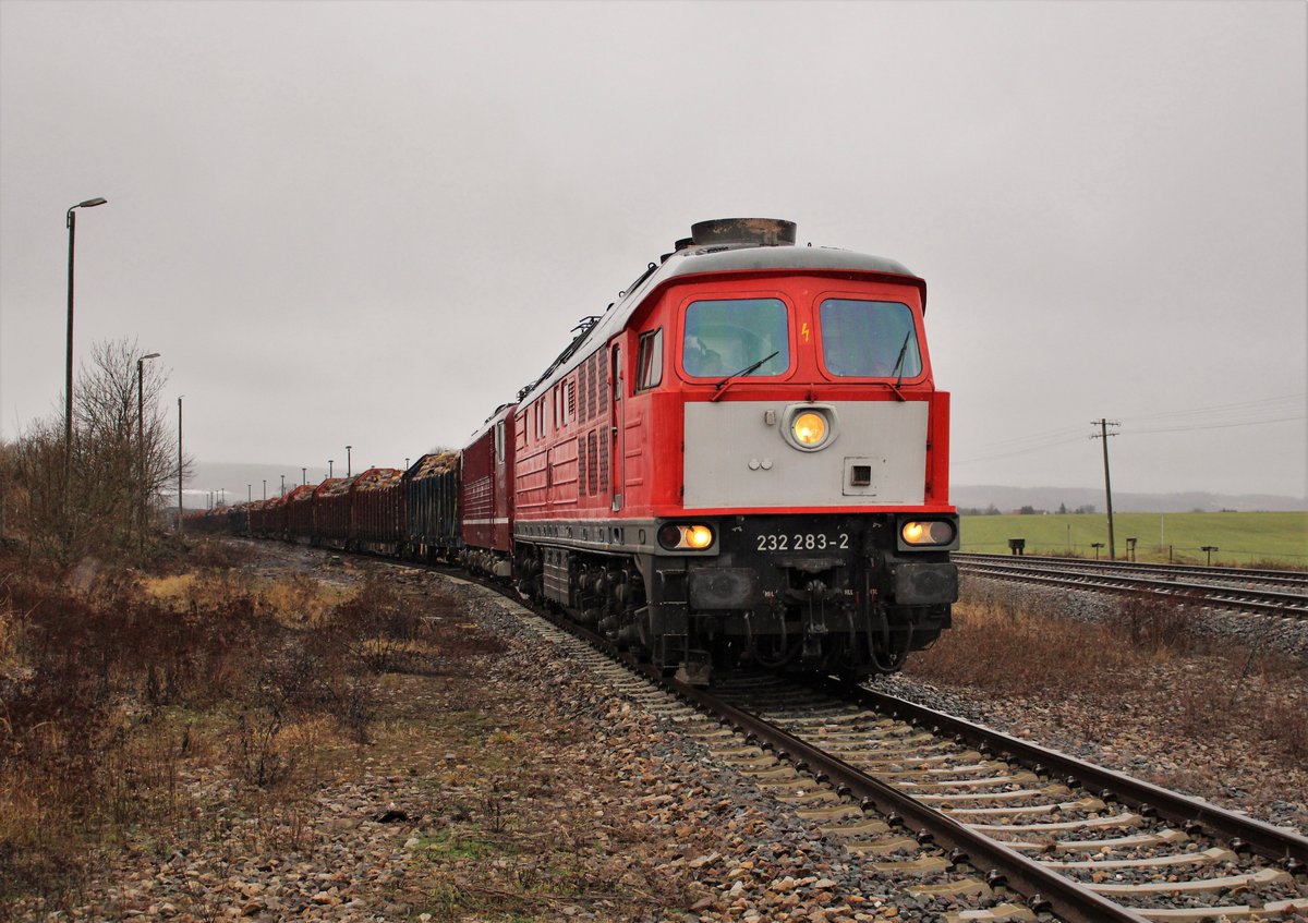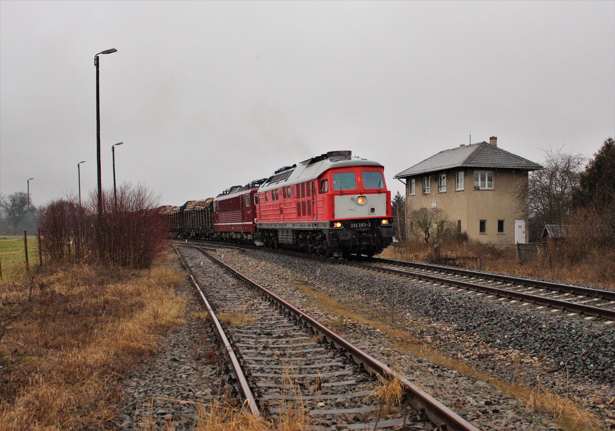 Am 12.03.21 fuhr die 232 283 und 155 159 (der WFL) einen Holzzug von Triptis nach Saalfeld. Ab Saalfeld übernimmt 155 159 den Zug bis Kaufering. Hier ist 232 283 beim umsetzen in Triptis zu sehen. Alexander Hertel