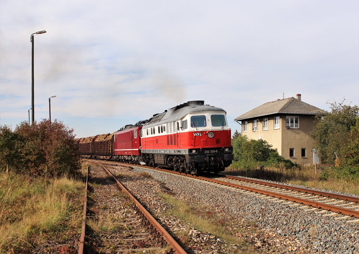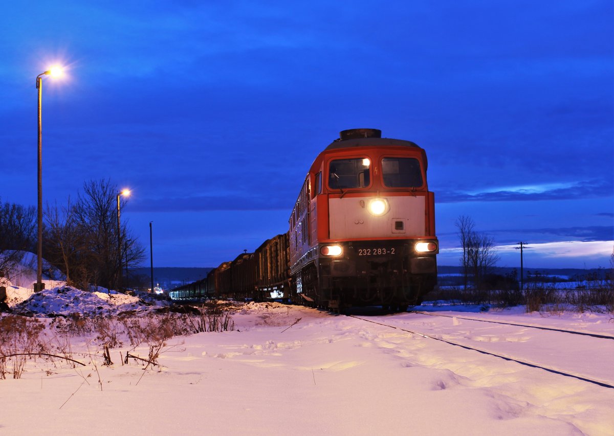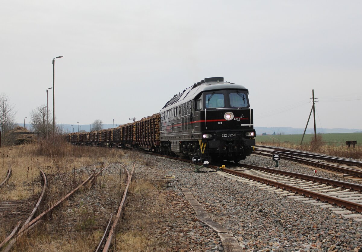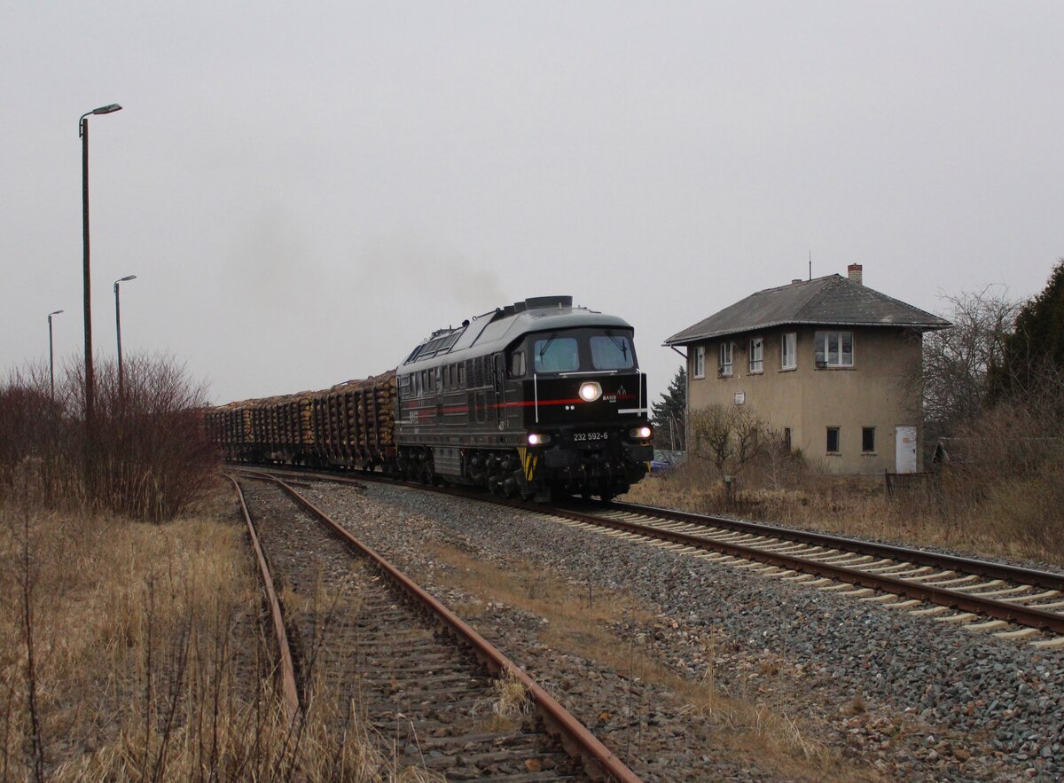 Am 12.03.21 fuhr die 232 283 und 155 159 (der WFL) einen Holzzug von Triptis nach Saalfeld. Ab Saalfeld übernimmt 155 159 den Zug bis Kaufering. Hier ist 232 283 beim umsetzen in Triptis zu sehen. Alexander Hertel