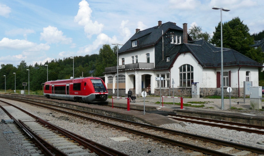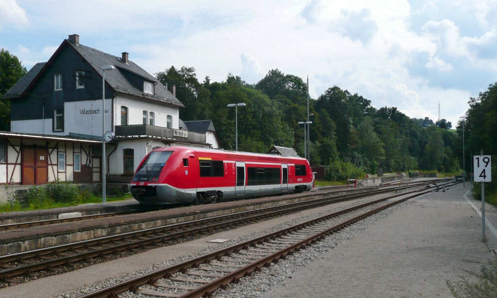 Blick nach Südosten auf 641 038 18.8.11. Die Gleise führen am rechten Bildrand zum Prellbock, und daher liegt das hübsche Städtchen Wurzbach. Leider wurde bei der Modernisierung der Bahnsteig nicht näher dorthin gelegt.
