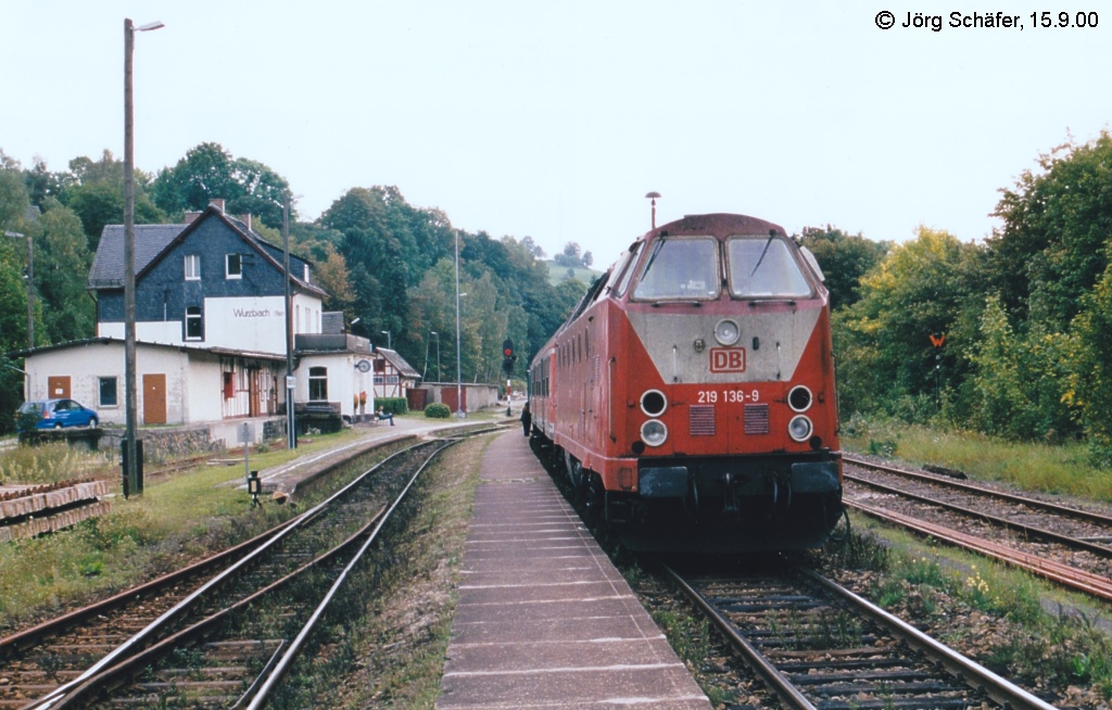 Blick nach Süden auf Wurzbach am 15.9.00: Der Aufenthalt wurde durch den Einsatz von Steuerwagen auf wenige Minuten gekürzt, da 219 136 am nördlichen Zugende bleiben konnte und nicht umsetzen musste.