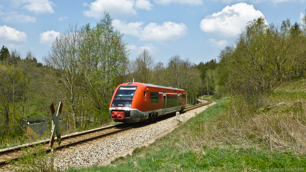 Dieser Walfisch VT 641 bewältigt gerade die letzten 100 m vor dem Kopfbahnhof Wurzbach (Thür), wo er auf seiner Fahrt als RB Saalfeld - Blankenstein die Fahrtrichtung wechseln wird. (01.05.2012)