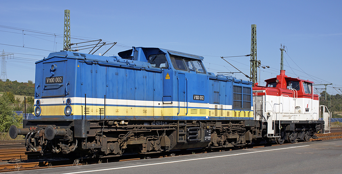 V 100 002 (202 439-6) und Johanna 01 (364 847-4) der Johann Walthelm GmbH im Bahnhof Gerstungen am 03.10.2013. Die V 100 wurde 1972 beim VEB Lokomotivbau Elektrotechnische Werke (LEW) Hans Beimler in Hennigsdorf mit der Fabriknummer 13478 gebaut und kam am 6. März des selben Jahres als 110 439-7 der DR zum Bw Stendal. Am 30.07.1985 erfolgte die Umzeichnung in 112 439-5 und bekam am 01.01.1992 noch vor dem Zusammenschluss beider deutscher Staatsbahnen die DB-konforme Betriebsnummer 202 439-6. Diese führt sie noch heute als Teil der aktuellen UIC-Nummer 98 80 3202 439-6 D-JW. Nach Aufenthalten in Salzwedel und Stralsund (noch zu DR-Zeiten) sowie Erfurt und Meiningen (DB) wurde sie am 05.06.1997 z-gestellt und am 31.03.1998 ausgemustert. Nach mehrfachem Besitzerwechsel (EBM Cargo, TSD und Nordic Rail) ist sie z.Z. im Besitz von Johann Walthelm. Ingo Konrad Müller