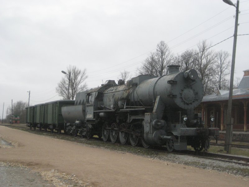 Ehemalige Baureihe 52 der Deutschen Reichsbahn aus dem Jahre 1943, jetzt mit der Nummer 52 3368 unter freiem Himmel direkt an der Ostseeküste. Über Ungarn und Russland kam diese Lok nach Estland, wo sie bis 1953 mit 137 weiteren ihrer Art ihren Dienst tat. Aufnahme vom 14.3.2008.
