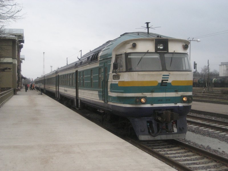 Vorderansicht des Triebzuges DR1B 3712 im Bahnhof Tartu, Richtung Tallin, 12.3.2008, 17.19 Uhr. In wenigen Minuten geht es los, dann mit eingeschaltetem Scheinwerfer oben. Achim Sinhuber