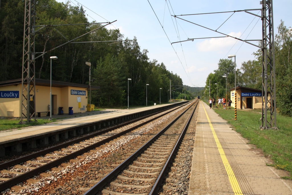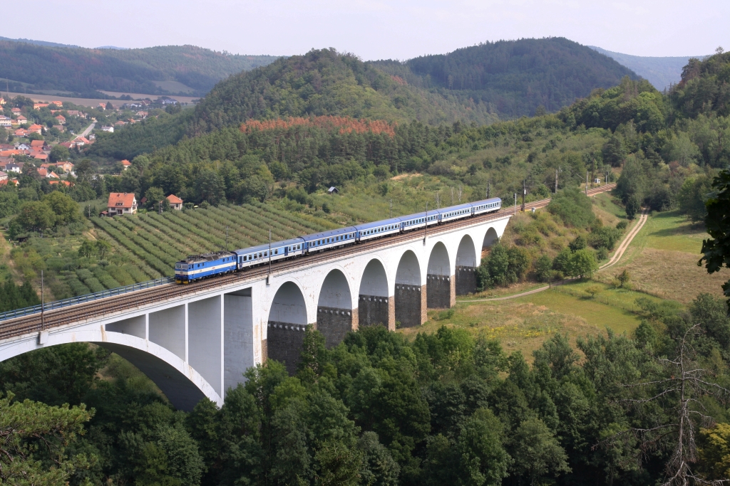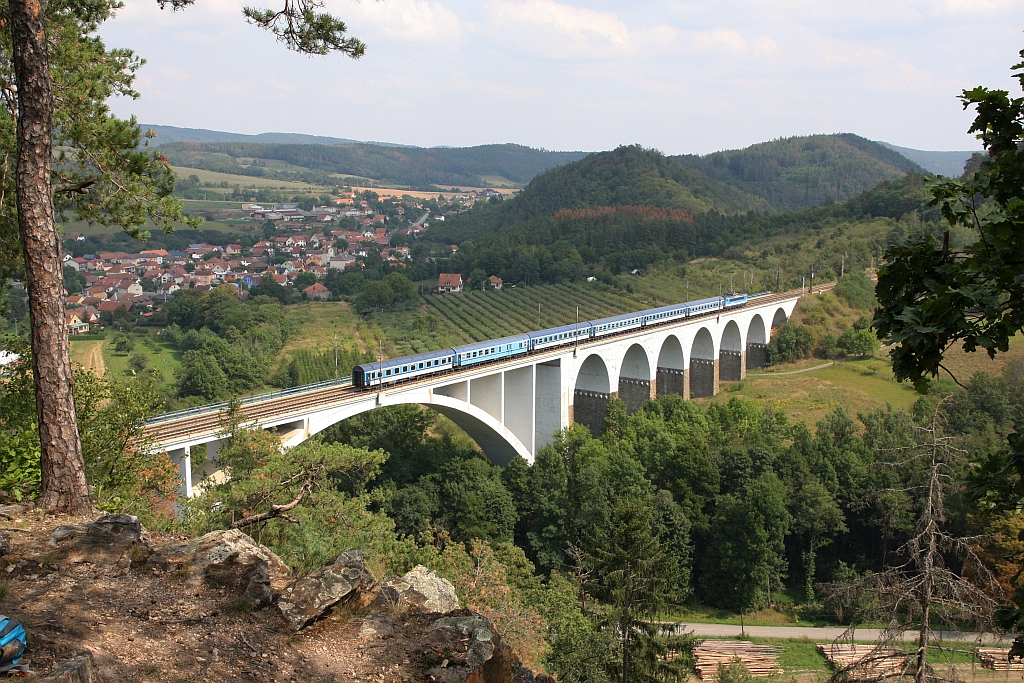 Zwischen der Haltestelle Dolni Louck und dem Westportal des Loucsky Tunnel wird im Strecken-Km 35,6 der KBS-Strecke 250 (Brno - Havlíčkův Brod) mit der 300m langen und 30m hohen Brücke des Friedens (Most míru) das Tal der Libochovka überquert. Der 120 m lange Hauptbogen gilt als längster Eisenbetonbogen Tschechiens. Bild vom 24.August 2019. Karl Seltenhammer