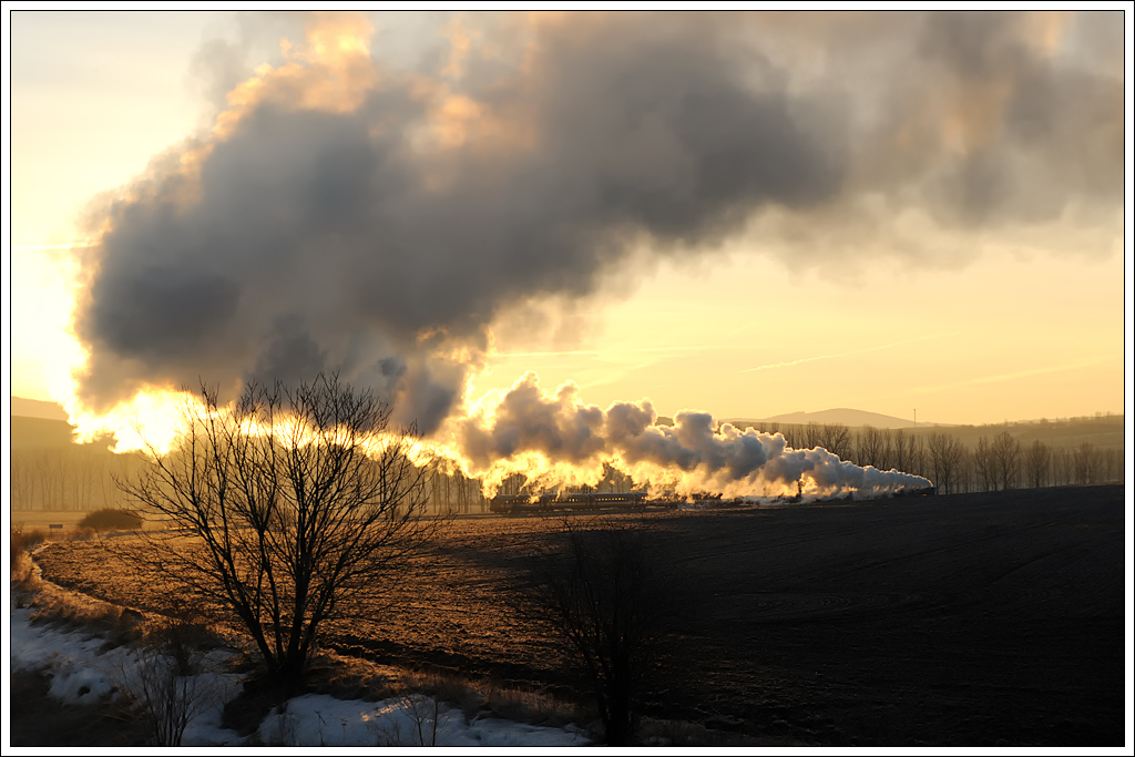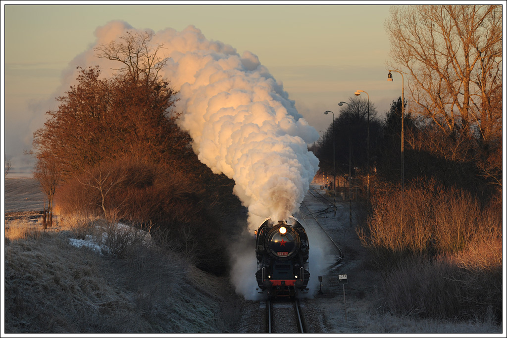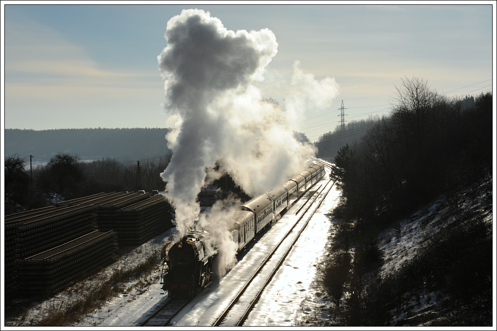 498.104 mit dem Jubiläumssonderzug Sp 11045 von Veselí nad Moravou nach Nové Mesto nad Váhom am 29.12.12 aufgenommen kurz vor Javorník. Hanspeter Reschinger