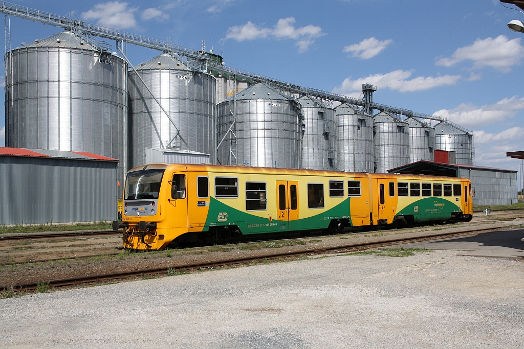 CD 914 069-0 ist am 09.August 2019 als Os 24810 von Znojmo im Bahnhof Moravske Budejovice angekommen und wird 41 Minuten später als Os 24852 nach Okrisky weiterfahren. Karl Seltenhammer
