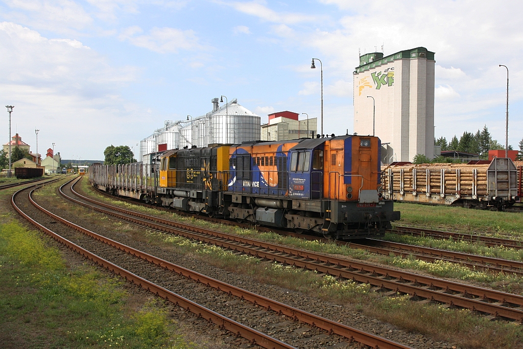 CZ-RCAS 98 54 4 702 586-9 (historisch als CSD T212 0586 angeschrieben) als Os 18394 (Moravske Budejovice - Jemnice) und CD 814 010-5 (als Os 24814, Znojmo - Okrisky) am 14.Juli 2018 im Bahnhof Moravske Budejovice. Karl Seltenhammer
