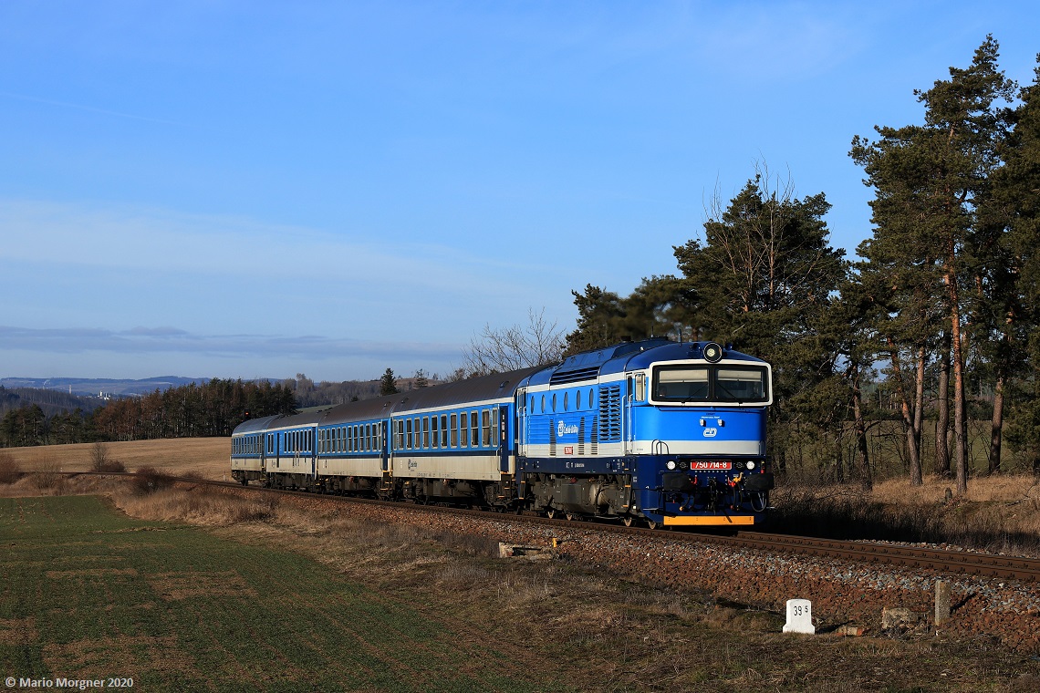 750.714 mit den Rožmberk R 653 Jihlava - Brno unterwegs zwischen Vladislav - Studenec, 13.02.2020