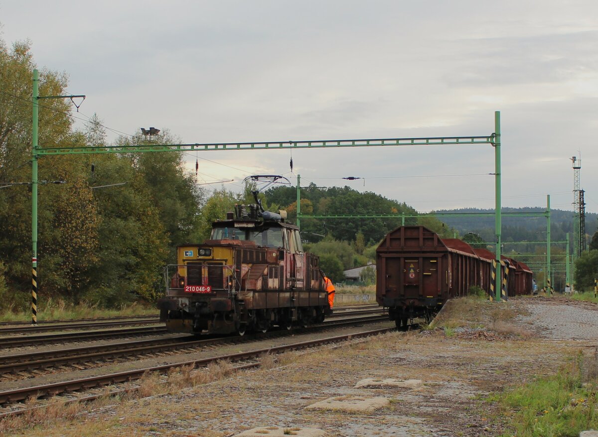 Bei einem Kurzbesuch am 8.8.2023 in Vyssi Brod traf ich im Bahnhof auf diesen kurzen Güterzug mit Zuglok 210046-9. Die Lok gehört zu einer Wechselstrom Baureihe und stammt, wie wohl auch ihre Lackierung, noch aus der CSD Ära. Neben zwei mit Holz beladenen Güterwagen führte der Zug einen Begleitwagen für den Rangierer mit. Dieser stellte auch die Weichen von Hand. Nachdem der Güterzug von einem überholenden Personenzug nach Rybnik passiert worden war, setzte er nun vom ersten Gleis am Hausbahnsteig um in das Ausfahrgleis 2. Gerd Hahn