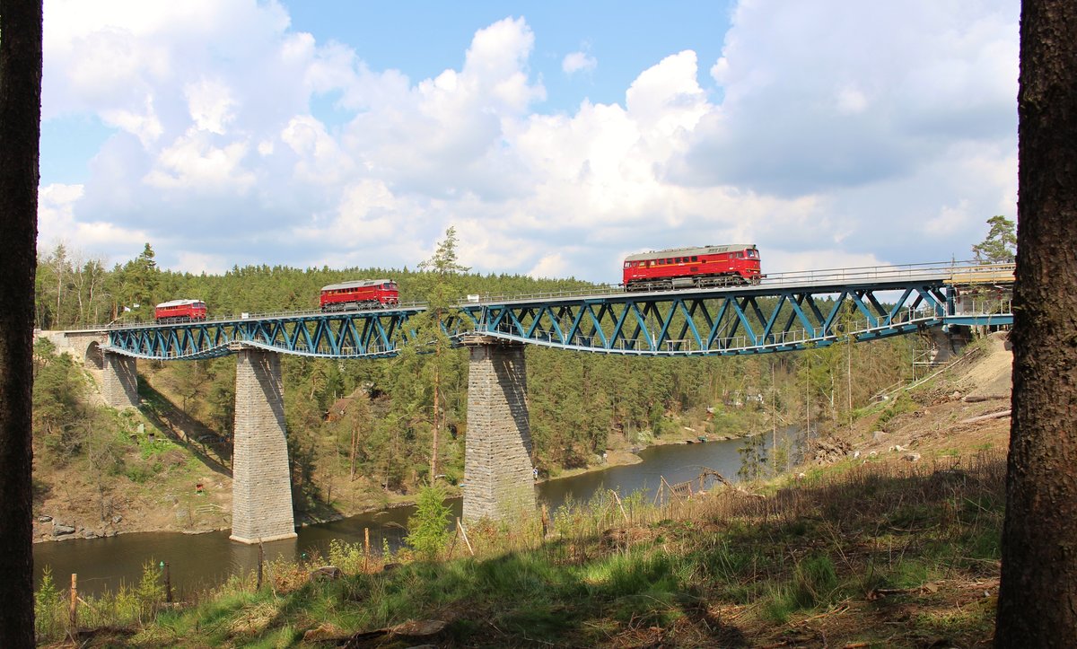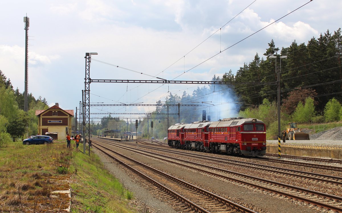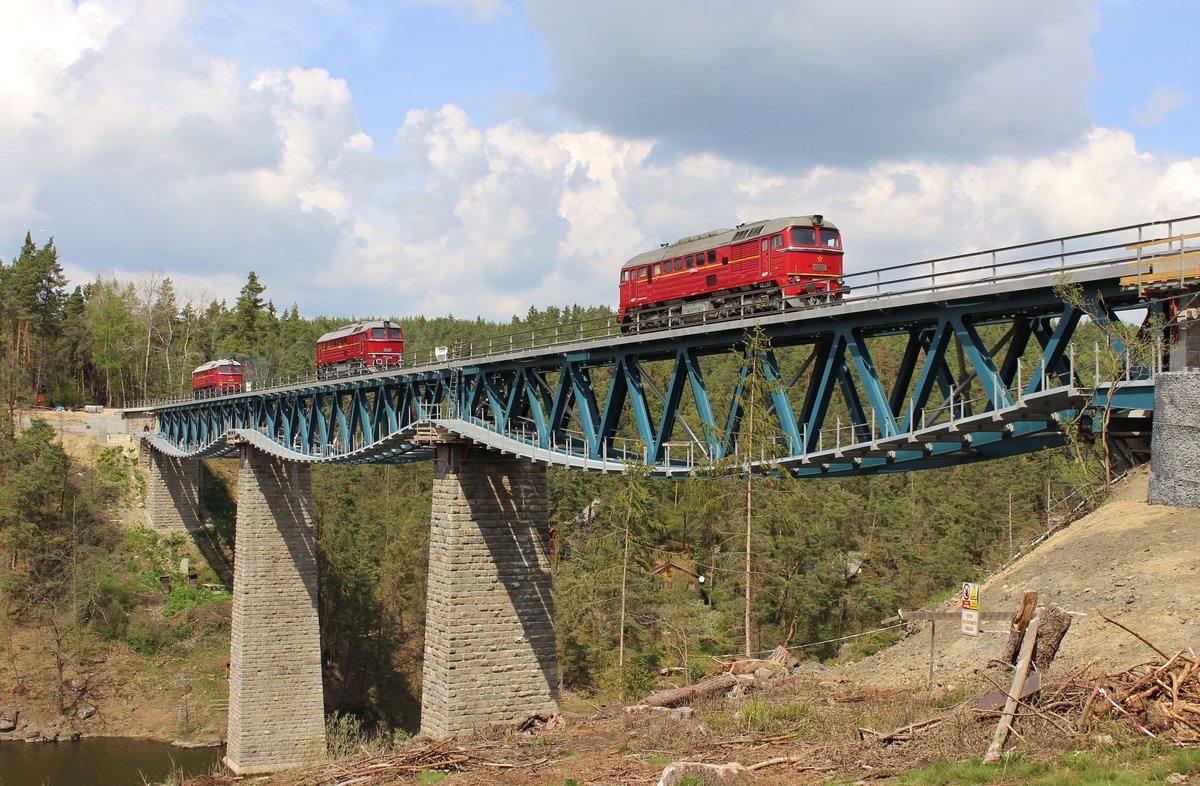 Am 27.04.19 wurde auf der Strecke (Trat 177) Pňovany – Bezdružice das Pňovanského viaduktu auf ihre Belastung getestet. Die Loks waren T 679 1600 aus Lužná u Rakovníka, T 679 1578 aus Klatno, und T 679 1529 aus České Budějovice. Hier sind die Loks zur Abfahrt bereit in Pňovany. Alexander Hertel