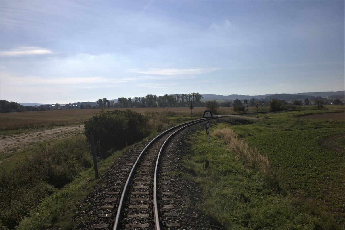 die einzige Strecke mit Regelzugbetrieb.Eine Diesellok mit einem Personenwagen.