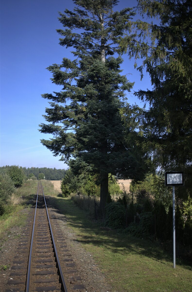 Die Streckentanne bei Amalin. 01.10.2021 , 11:55 Uhr. Blick von der hinteren Plattform auf die Strecke.