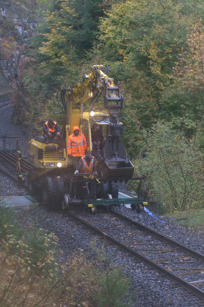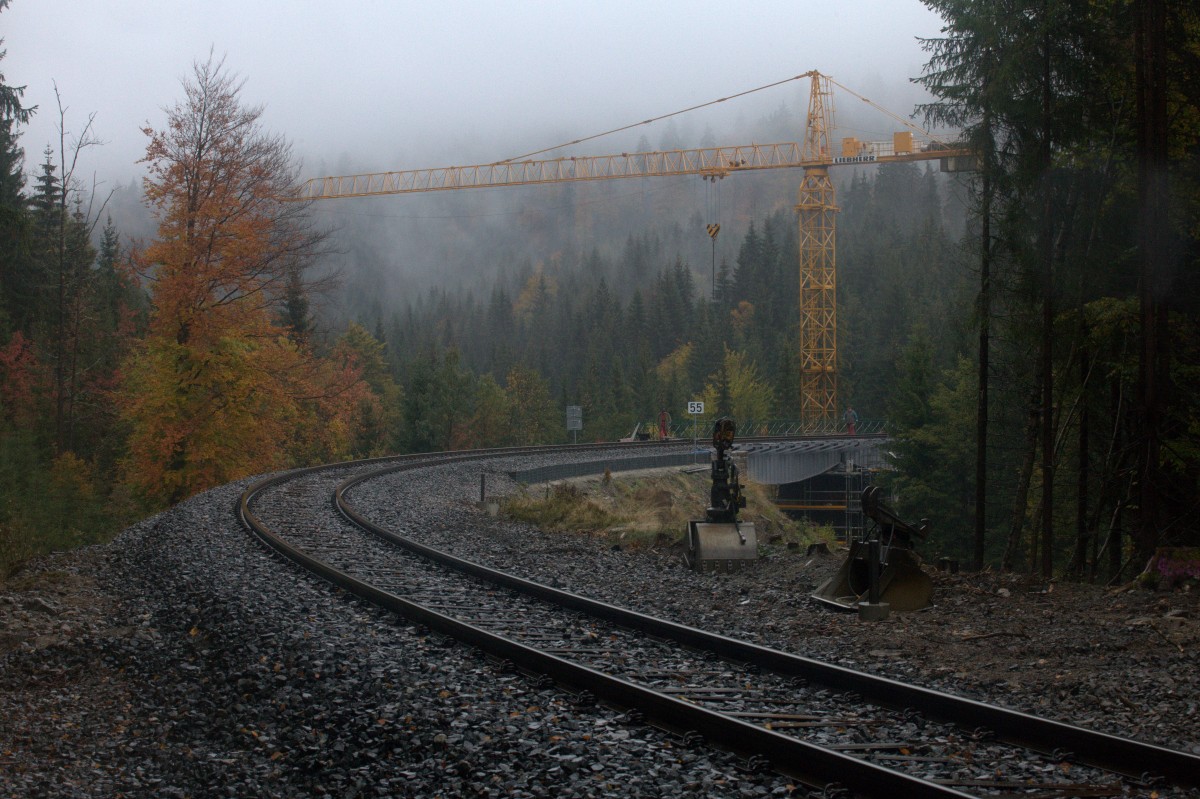 Zwischen Korenov und Harrachow wird die Brücke über die Iser saniert, deshalb kein regulärer Zugbetrieb, aber ein Zweiwegebagger konnte bei Regenwetter auf der Wanderung abgelichtet werden. 14.10.2015 16:02 Uhr. Nähe Iserviadukt bei Korenov. Siegfried Heße