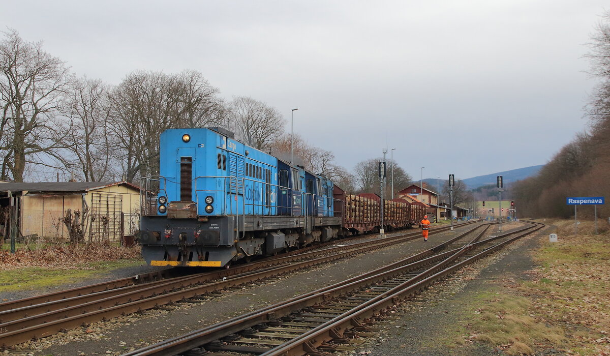 Die 743 008 der CD Cargo in grün/gelb konnte mit dem Holzzug als Mn 84000 bei der Ausfahrt vom Bahnhof Raspenava auf dem Weg nach Frydlant am 11.03.2024 bildlich festgehalten werden. Andreas Schreiber