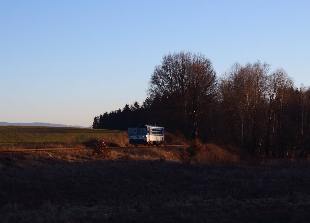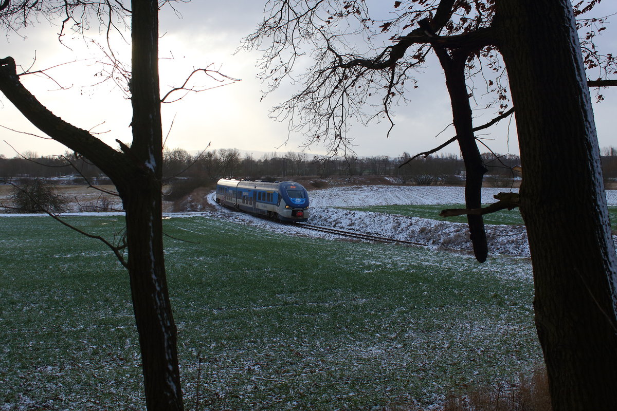 Leicht gepudert die Landschaft bei Tršnice mit dem OS nach Luby, die sonne kam bei der Durchfahrt des Regiosharks 844 004 fast noch durch die Wolken hindurch. Aufgenommen am 2.1.2019 Andreas Schreiber