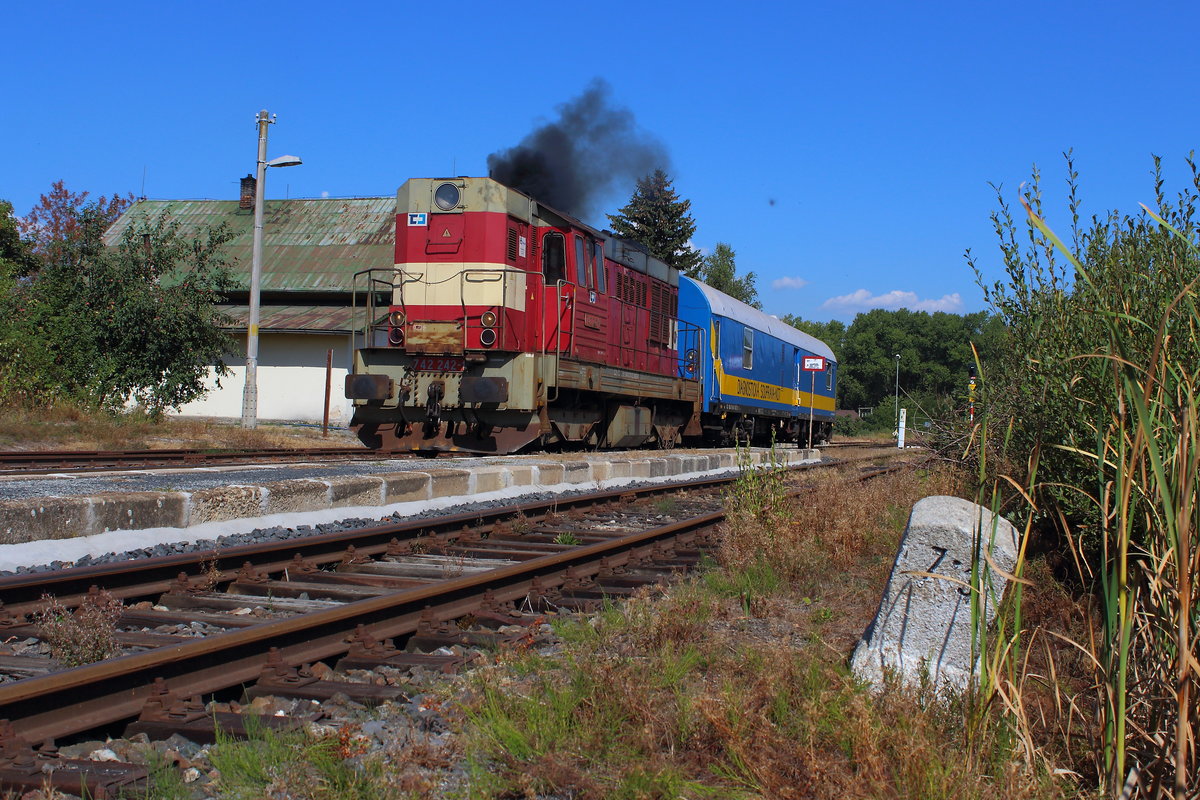 "Egronet-Erkundungstour 16.-18.08.2013" Dank dem Entgegenkommen des CD-Personals war es möglich Unterwegshalte des Os27215 als Fotohalt zu nutzen, hier 844 019 im Bf Nový Kostel am 16.08.2013. Rüdiger Ulrich