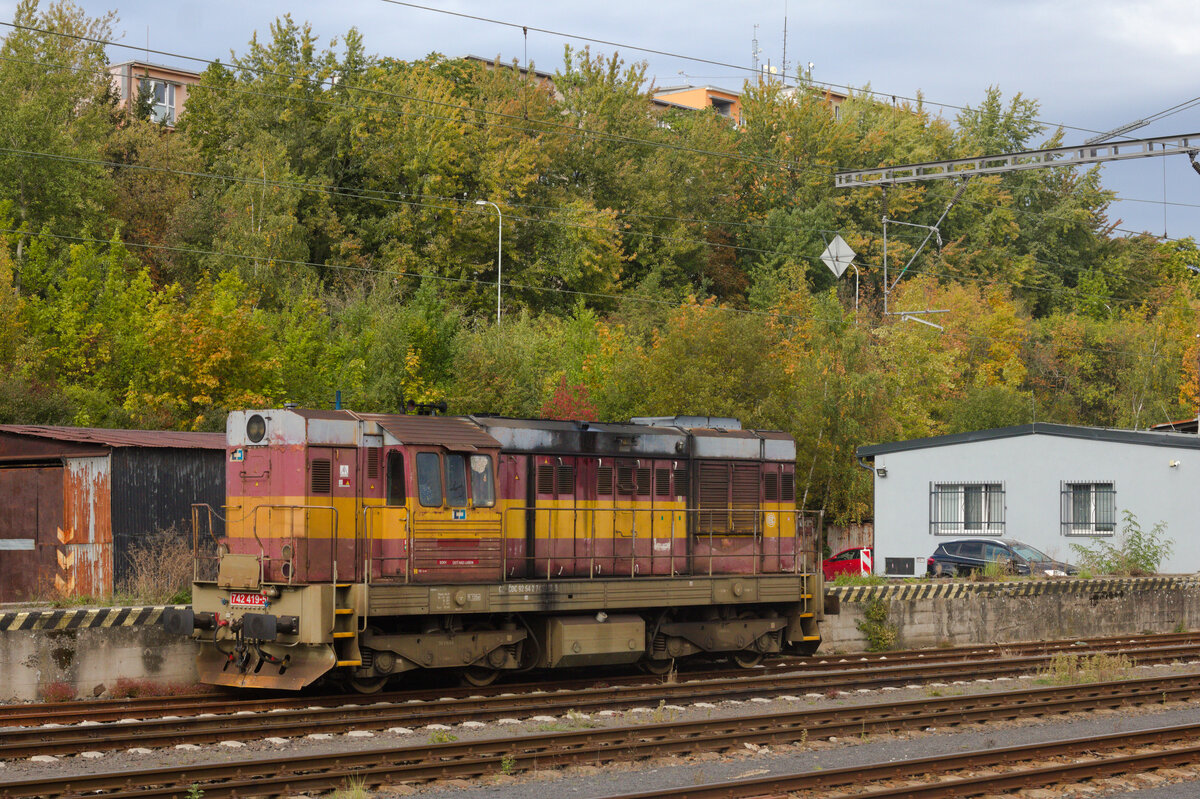 22.6.2014 09:12 ČD 242 218-6 mit einem Personenzug (Os) abgestellt im Bahnhof Karlovy Vary, am Ende des Zuges befindet sich ČD 242 250-9. Mitch Schlosser