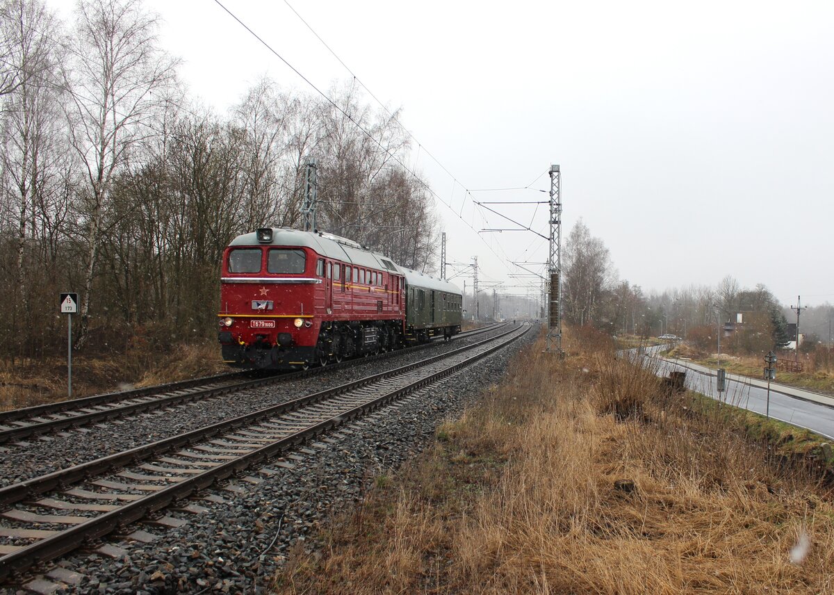 Schneefall am 1.4.2022 bei Einfahrt in Chodov des Ganzzuges mit der 363 503 und 363 513 aus Richtung Karlovy Vary. Die grünen Eamnoss werden höchstwahrscheinlich für die Umliegenden Schrotthändler bzw. zur Sandbeladung am Bahnhof Chodov genutzt. Andreas Schreiber