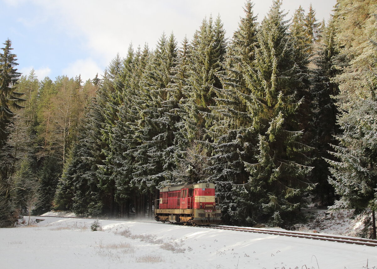 742 305, mit Holz beladenen Eanos aus Nejdek auf dem Weg nach Nove Sedlo. Nach Schneefall in der Nacht zum 11.3.2023 hüllt sich das Tal an der Rolava in ein weißes Kleid Andreas Schreiber