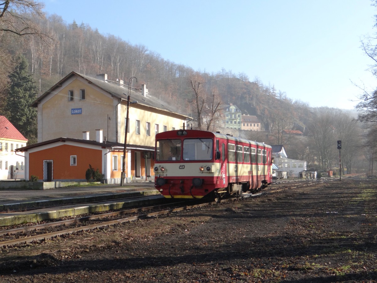 810 425-9 als Os 27150 ist am 13.02.24 bei der Einfahrt in Loket předměstí zu sehen. Der Endpunkt wird wochentags viermal angefahren und an den Wochenenden nur einmal pro Tag. Alexander Hertel