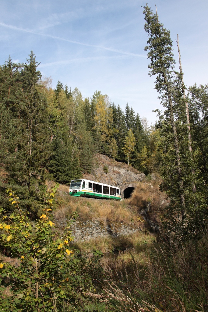 Am 26.09.2012 ist VT32 (654 032) der VBG für GW Train Regio auf der S´DC149 eingesetzt, auf seiner Fahrt von Karlovy Vary nach Mariánské Lázně hat er soeben als Os7105 den Dolnahamerský-Tunnel II nahe Bečov n.T. verlassen. Rüdiger Ulrich