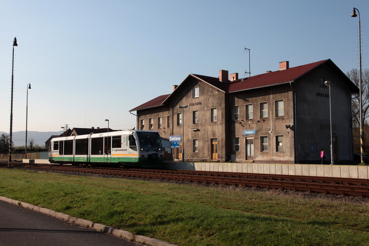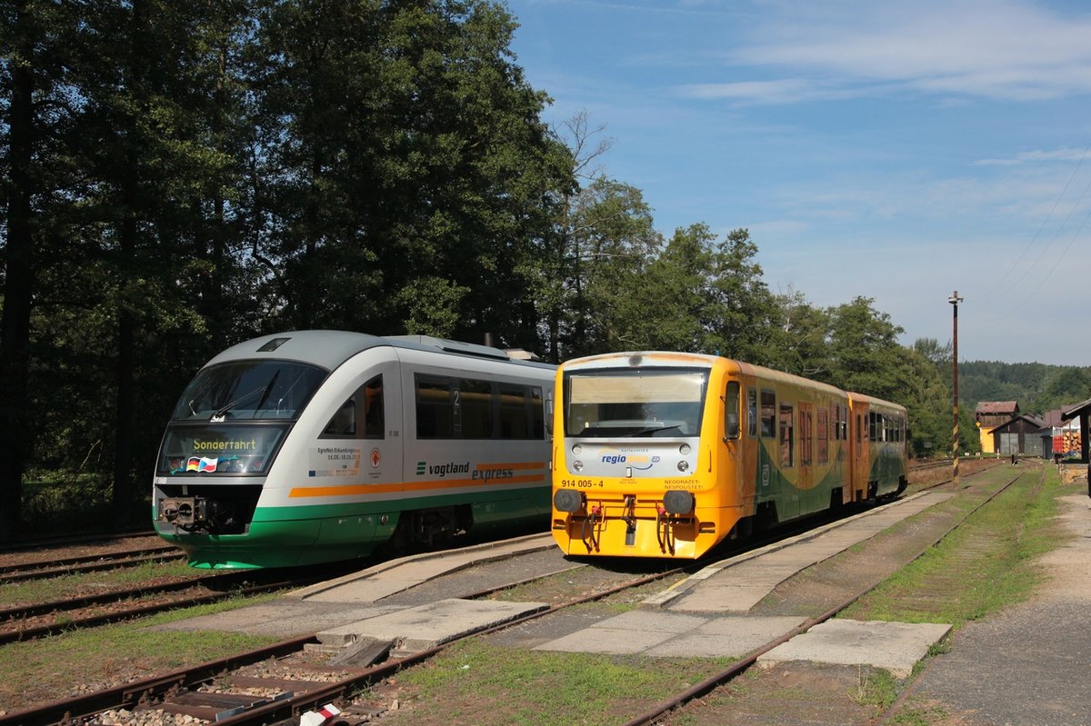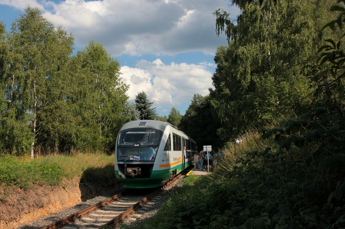 "Egronet-Erkundungstour 16.-18.08.2013" Nochmals VT08, als ZOs36088, in Horní Slavkov-Kounice am 17.08.2013, auf der Fahrt nach Krázný Jez war die Hütte brechend voll, das halbe Dorf fuhr mit! Heute gehört dieser Streckenabschnitt, laut Kursbuch, zur KBS 161. Rüdiger Ulrich