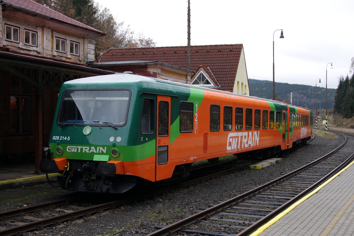 VT48 der VBG als MOs20817 (Zwickau Zentrum - Sokolov) bei der Ausf. aus dem Bf Kraslice předměstí (Graslitz Vorstadt) am 19.11.2012. Bereits in Zwotental hat das Personal von GW Train Regio den Zug übernommen und ab Kraslice ist es eine Leistung dieses Unternehmens. Rüdiger Ulrich