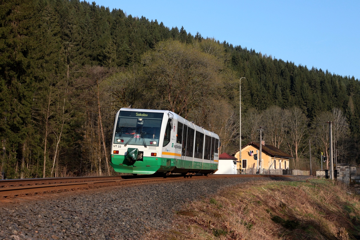 Der RegioSprinter 654 033 der DLB (Die Länderbahn) bei Ausf. aus dem Bf Rotava, als Os17015 (Kraslice - Sokolov), am Morgen des 19.04.2018. Z.Z. fahren auf der RB1 und RB5 im Vogtland noch meist die 8 verbliebenen RegioSprinter der DLB und der 654 037 von GWTR, auch im Durchlauf von Zwickau bzw. Mehltheuer/Plauen bis Sokolov, Personalwechsel zw. DLB und GWTR ist dann in Zwotental. Die tschechischen Binnenzüge auf der KBS145 fahren teilweise mit 810er-Garnituren von GWTR oder wie hier mit 654 der DLB. Rüdiger Ulrich